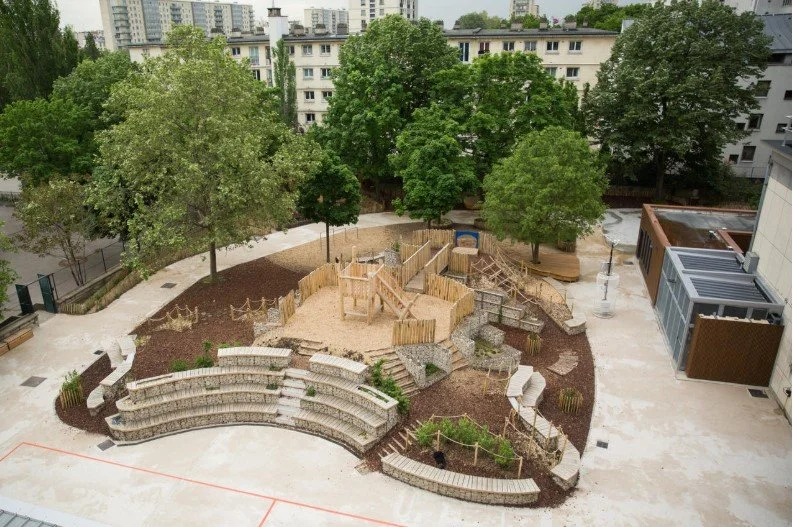 Les cours rénovées sont plus végétales, avec des matériaux naturels, moins d’asphalte, et parfois des points d’eau. Elles peuvent aussi être utilisées comme support pédagogique pour l’enseignement à l’extérieur.